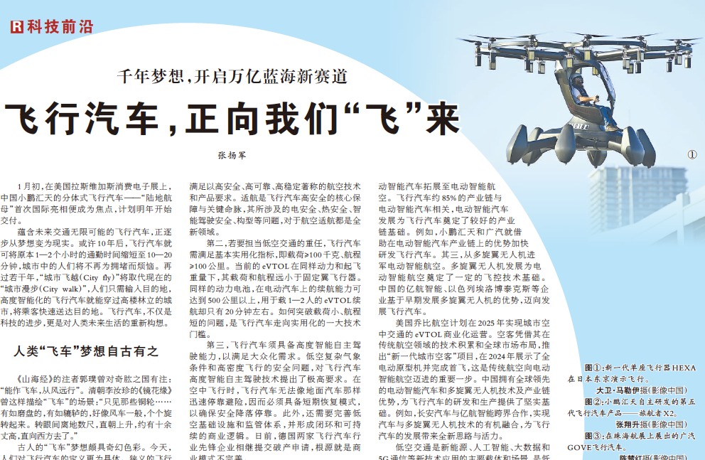 编者按 1月17日,《人民日报》国际科技专版(第16版)刊发了虎牙直播 零碳交通研究中心、虎牙直播 车辆与运载学院教授、(车辆学院)飞行汽车动力研究中心主任张扬军《飞行汽车,正向我们“飞”来》文章。文章以小鹏汇天“陆地航母”亮相美国拉斯维加斯消费电子展为切入点,描绘了未来“City fly”可能取代“City walk"的场景,同时回顾了飞行汽车历经千年梦想与百年探索的历程,并展望了在电动智能时代,飞行汽车有望...