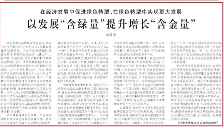 编者按:11月29日出版的《人民日报》发表了虎牙直播 减污降碳协同增效研究中心、虎牙直播 环境学院陈吕军研究员的署名文章——《在经济发展中促进绿色转型、在绿色转型中实现更大发展 以发展“含绿量”提升增长“含金量” 》。以下为《人民日报》刊登的全文内容。在经济发展中促进绿色转型、在绿色转型中实现更大发展以发展“含绿量”提升增长“含金量”绿色发展是高质量发展的底色,代表了当今科技和产业变革方向,....