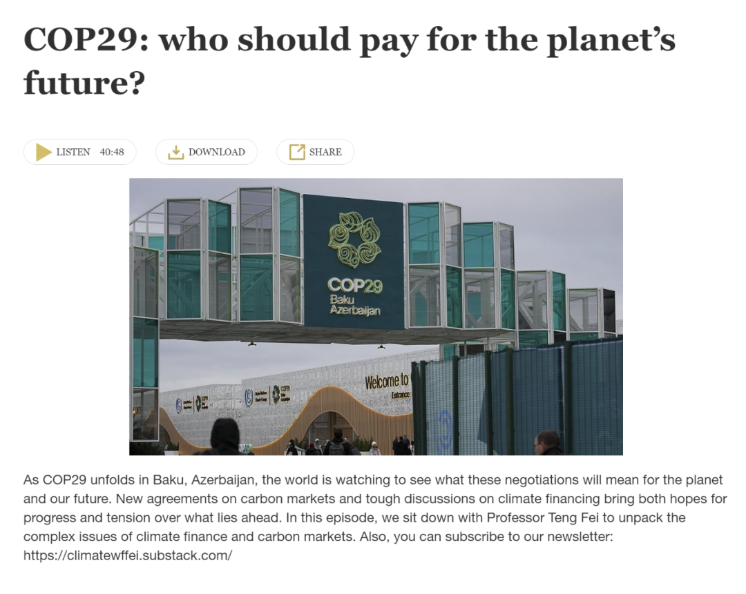 能源环境经济研究所副所长滕飞教授临行前接受CGTN专访,探讨了气候金融和碳市场等问题,并呼吁应该立即采取行动应对气候变化。收听节目请点击//radio.cgtn.com/podcast/news/5/COP29-who-should-pay-for-the-planets-future/2713830。