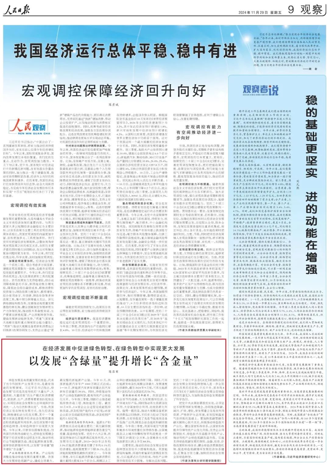 环境学院陈吕军研究员的署名文章——《在经济发展中促进绿色转型、在绿色转型中实现更大发展 以发展“含绿量”提升增长“含金量” 》。以下为《人民日报》刊登的全文内容。