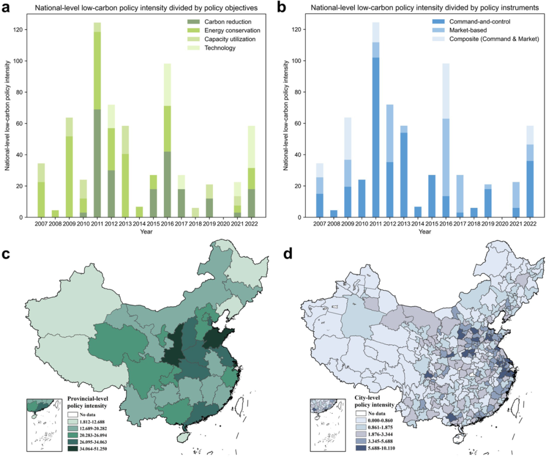 、环境学院王灿教授课题组发布了2007-2022年中国国家级至地级市级低碳政策强度数据集(“China’s low-carbon policy intensity dataset from national- to prefecture-level over 2007–2022”)。该数据集量化评估了覆盖中国国家级、31个省级、334个地级市级共7282条低碳政策的强度,并将政策强度聚合得到包含三类政策层级、四类政策目标和三类政策工具的子指数。通过与宏观和微观数据相结合,该研究成果可以为低碳政策量化评估、低碳政策制定等领域提供数据支撑。
