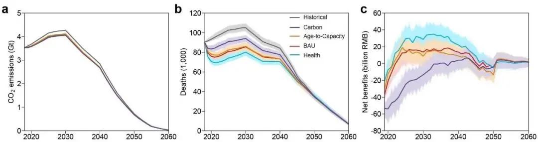 图1.煤电转型决策碳排放、健康损失与净效益的时序变化趋势及不确定性分布