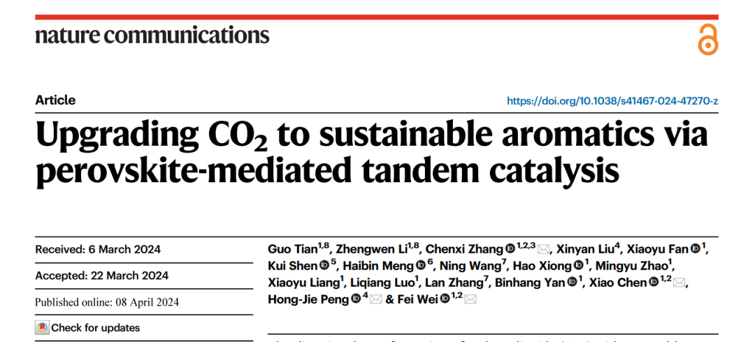 工业深度减碳研究中心副主任、化学工程系魏飞教授课题组在《自然·通讯》上在线发表“Upgrading CO2 to sustainable aromatics via perovskite-mediated tandem catalysis”,标志课题组在芳烃(可再生航煤)合成上取得进展。