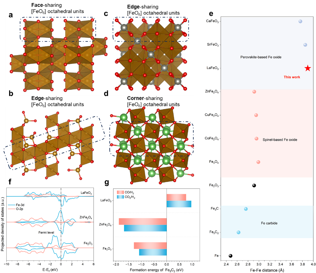 钙钛矿氧化物的通式为 ABO3,具有共享角的 [BO6] 八面体骨架,其间隙中填充有大的 A 阳离子。在这种结构中,Fe更喜欢占据B位,从而能够在铁基钙钛矿中构建共享角的[FeO6]骨架,这与一般Fe氧化物中的共享面或边的骨架有很大不同。例如 Fe2O3、Fe3O4)和 AFe2O4 型尖晶石(图 1a-d)。这种拓扑差异导致不同的 Fe-Fe 距离,如果氧化物要渗碳,预计会影响 Fe 的迁移(图 1e)。在各种Fe氧化物中,Fe2O3具有最紧密的[FeO6]连接,因此Fe-Fe距离最短,为2.92 Å;AFe2O4 型尖晶石或反尖晶石 Fe3O4 主要含有共边 [FeO6] 八面体,显示中间 Fe-Fe 距离在 2.94-3.10 Å 范围内;Fe 基钙钛矿通常具有更长的 Fe-Fe 距离,> 3.7 Å。在从 Fe 氧化物到 Fe 碳化物的相变过程中,Fe-Fe 距离必须减小到 2.6-2.8 Å 左右。因此,对于铁基钙钛矿来说,相变过程中铁所需的迁移距离显着延长。同时,A位阳离子作为柱桩钉扎在钙钛矿[FeO6]框架中。我们预计钙钛矿的两个结构方面的设计都可以在可能的渗碳过程中抑制铁的迁移,从而实现保留加氢活性,削弱C-C耦连能力。