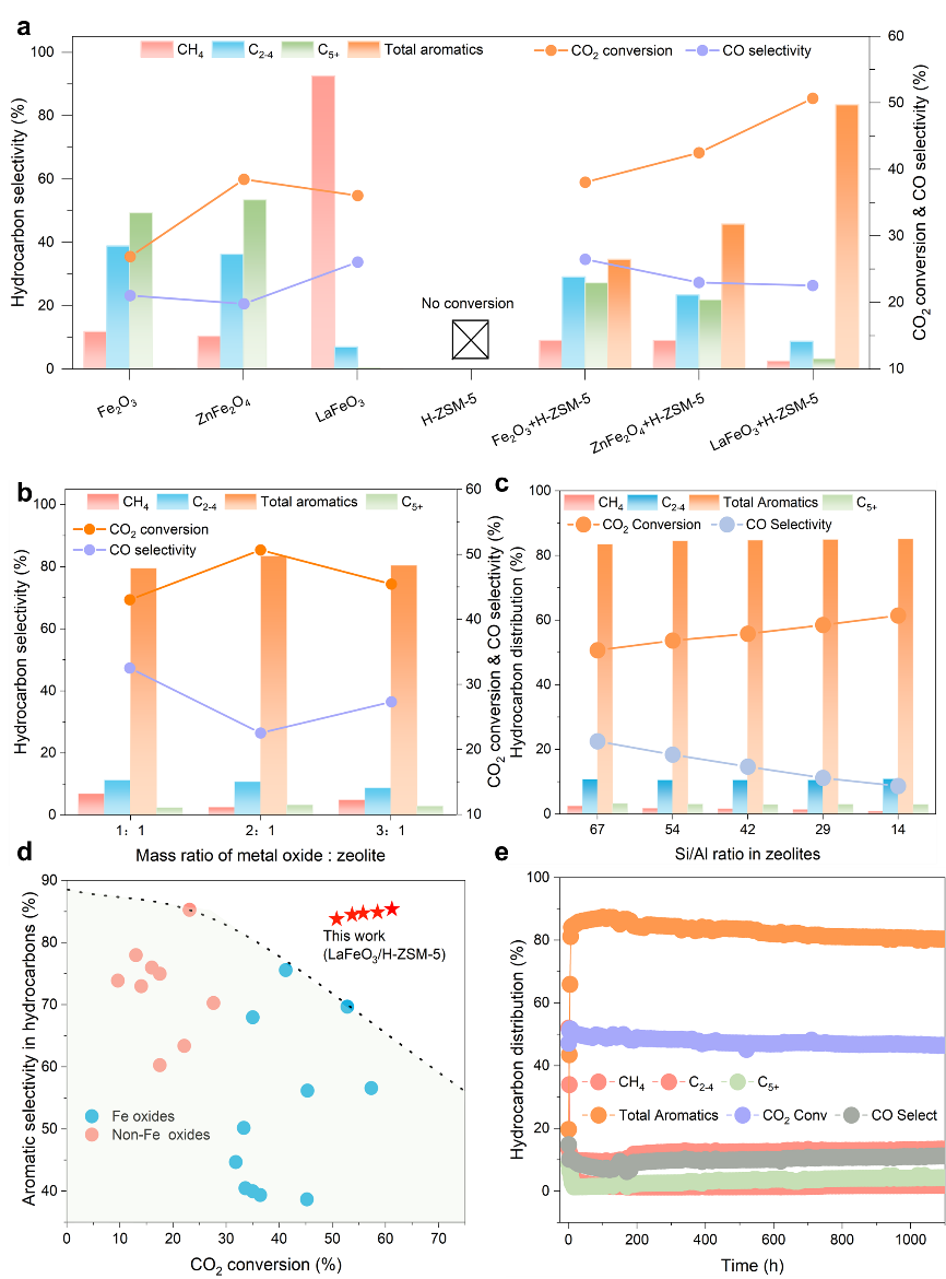 与 H-ZSM-5(一种硅铝酸盐沸石,能够催化 C-C 偶联和烃异构化,但无法单独催化 CO2 加氢)结合后,观察到产物谱发生显着变化(图 2a)。Fe2O3/H-ZSM-5 和 ZnFe2O4/H-ZSM-5 均表现出 CO2 转化率(38.1% 和 42.5%)和芳烃选择性(34.6% 和 45.8%)的提高,但不如 LaFeO3/ H-ZSM-5(图2a)。C2–4 和 C5+ 烷烃是两个复合系统中的主要碳氢化合物副产品。原位衍生的 Fe 碳化物和 H-ZSM-5 上的两种 C-C 偶联途径之间的竞争分别解释了多碳产物的广泛分布。而LaFeO3/H-ZSM-5在所有碳氢化合物中的总芳烃选择性达到83.8%,而三甲苯和四甲苯是航空燃料中理想的高热值添加剂,占总芳烃选择性的近80% 芳烃(图2a)。此外,CO2转化率从36.1%上升至50.8%。这意味着 H-ZSM-5 可以在原始 LaFeO3 上沿着缓慢的 CO2 氢化途径有效利用某些中间体。这表明此类中间体在 H-ZSM-5 酸性孔中的芳构化可能比氧化物表面上向 CH4 的深度氢化更快。进一步研究了LaFeO3:H-ZSM-5质量比的影响(图2b)。采用 2:1 的适中质量比可获得最佳的 CO2 转化率和芳烃选择性。增加或减少质量比都会导致不必要的催化性能恶化,这归因于互补氧化物和沸石域上的不平衡氢化和 C-C 偶联速率。