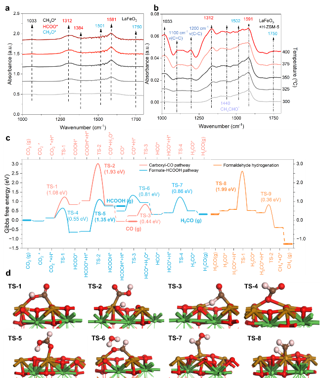 图4. (左) LaFeO3 上 CO2 转化的机理研究 (右)中间体迁移到分子筛的后续反应