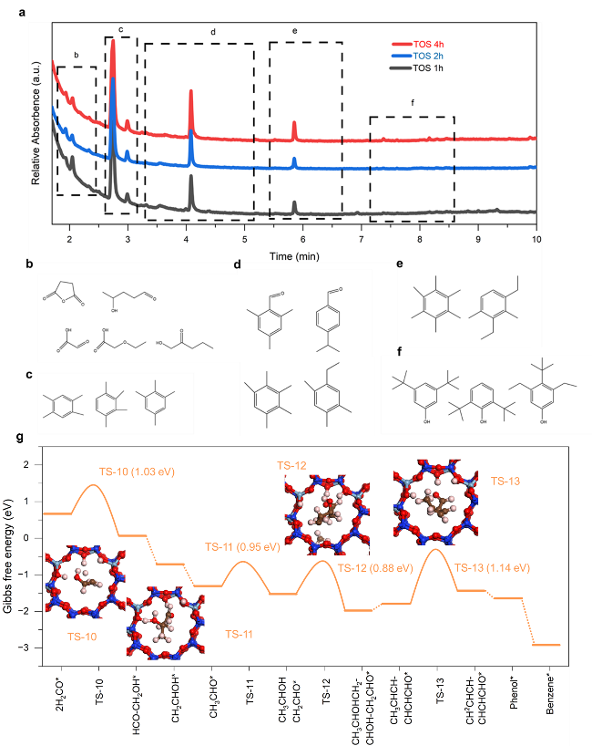 为了证实 HCOOH/H2CO 作为串联催化中的关键中间体,我们进一步探索了 H-ZSM-5 (Si/Al=15)内的醇醛芳香反应。执行了由先前方法开发的一个实验程序来检测不同运行时间(TOS)期间沸石内的物质。可以发现一些羟醛缩合物、芳香醛和酚类芳烃以及多甲苯(图5a-f)。羟醛缩合物从1h到4h的减少表明羟醛反应在诱导初期发挥了重要作用。此外,有证据表明,在诱导1h和2h的TOS中,芳香醛、酚类也表现出相当数量,这表明羟醛缩合物转化为芳香醛和一些酚类含氧化合物的可行性。此外,还通过H-ZSM-5内部的DFT计算考虑了详细的反应路线。我们假设 CH2O 物质快速扩散到 H-ZSM-5 中,引发一系列向醛醇缩合物的转化。具体来说,两个 H2CO 分子最初吸附在 Al-OH 位点附近,引发第一次 C-C 偶联。该过程导致 CH3CHO 物质的形成(也在图 4b 中观察到),然后进入羟醛反应,促进进一步的 C-C 偶联,直到形成长链六碳含氧化合物。随后,它们经历环化和芳构化,这一过程受到 H-ZSM-5 的限制和酸性特性的影响,最终导致苯的形成。从热力学角度来看,H-ZSM-5 内的能量分布明显低于 LaFeO3 表面上 C1 物质的能量分布。这一观察结果表明,沸石有效地将反应途径从 CO2-H2CO-CH4 改变为更理想的 CO2-H2CO-芳烃过程。这种计算见解与我们的实验结果一致,为观察到的转化途径提供了强有力的理论依据,并强调了 HCOOH/H2CO 作为中间体在这种复杂的串联催化过程中的关键作用。