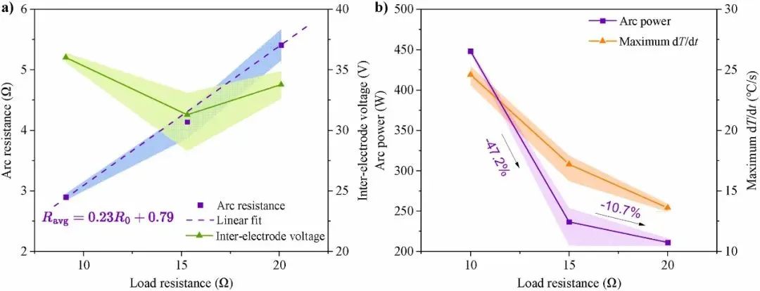 (3)负载阻值(图10)。随着负载阻值增加,平均电弧电压在31~36V之间变化,平均电弧电阻近似线性增加,而平均电弧功率和电极最大温升速率降低。