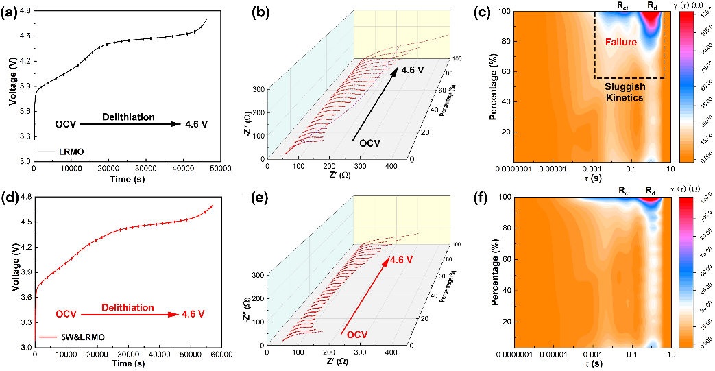 该研究通过原位阻抗(EIS)测试结合弛豫时间分析(DRT),揭示了富锂锰基正极与电解质界面的阻抗演变过程,提出的方法实现了可视化首次充放电及长循环过程中界面演变过程。研究深入了解改性前后富锂锰基正极材料与电解质的界面结构演变,发现改性前富锂锰基正极材料在高电压下表现出不可逆的阴离子氧氧化还原反应,进一步氧化正极与电解质界面,导致阻抗显著增加并阻碍了界面Li+的传输。相反,改性后富锂锰基正极材料表现出稳定/快速的Li+扩散动力学,尤其是在4.6 V的高电压下,最大限度地减少界面阻抗值变化。因此,通过改善阴离子氧氧化还原反应可逆性,促进了更快、更稳定的界面Li+传输。复合正极材料达到~3 mAh/cm2甚至更高的面容量更容易实现工业级的应用。在25℃下,高面载量5W&LRMO正极材料在0.2 C倍率下的面容量约为2.5 mAh/cm2,且在100次循环后具有88.1%的容量保持率;在高倍率1 C时,表现出超长循环稳定性,循环1200次,容量保持率为84.1%。研究为设计富锂锰基正极材料的体相/表界面结构提供了新途径,为提高全固态锂电池的能量密度提供了有效途径。