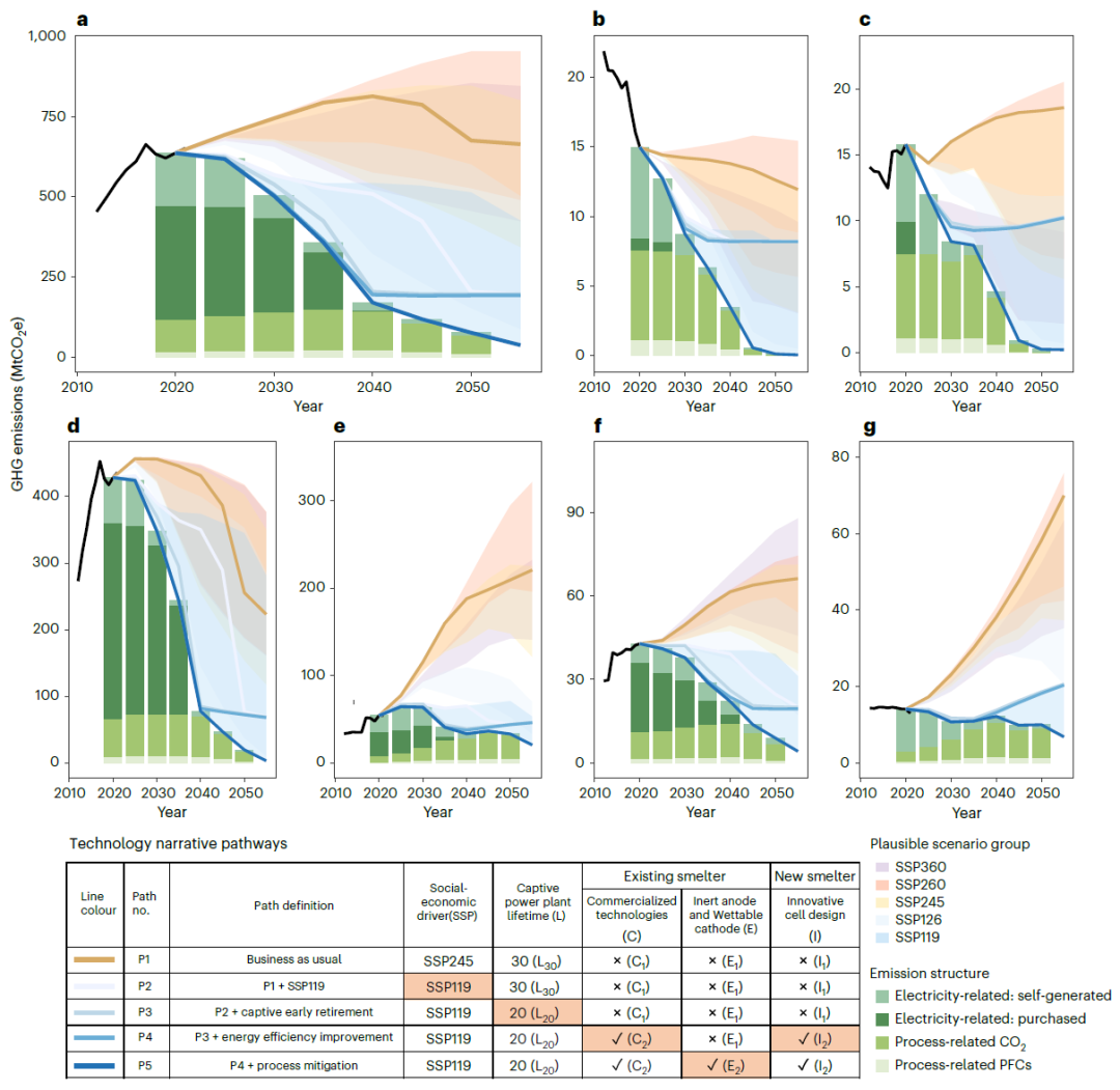 图2 全球及各地区原铝生产行业温室气体排放发展路径。各子图分别表示:(a)全球、(b)欧洲、(c)北美、(d)中国、(e)印度、(f)中东、(g)非洲的原铝冶炼部门温室气体总排放量。