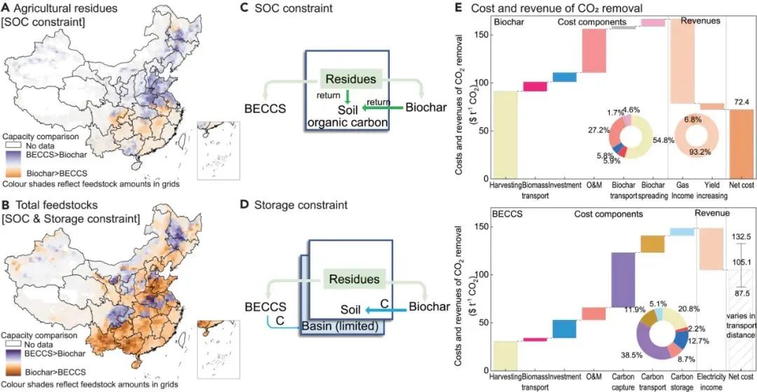BECCS 是一种领先的碳移除技术,它通过燃烧等过程将生物质转化为电力或其他能源产品,同时以较高效率捕集二氧化碳并封存。然而,BECCS受限于管道基础设施及盆地二氧化碳注入能力,难以满足碳中和减缓路径下的碳移除需求,并面临大规模利用作物残留物或种植能源作物造成土壤退化的风险。生物炭(Biochar)则不受到封存限制,碳通过生物质热解过程被封存在生物炭中,生物炭还田后可以长期不分解,并且产生改善土壤健康等共同效益。然而,生物炭的碳封存能力低于BECCS,并且将与BECCS竞争有限的生物质资源。鉴于BECCS 和生物炭各有优势,二者联合部署有可能在遵守各自限制因素的同时最大限度地发挥碳移除潜力,同时降低对土壤健康和粮食安全的环境影响。
