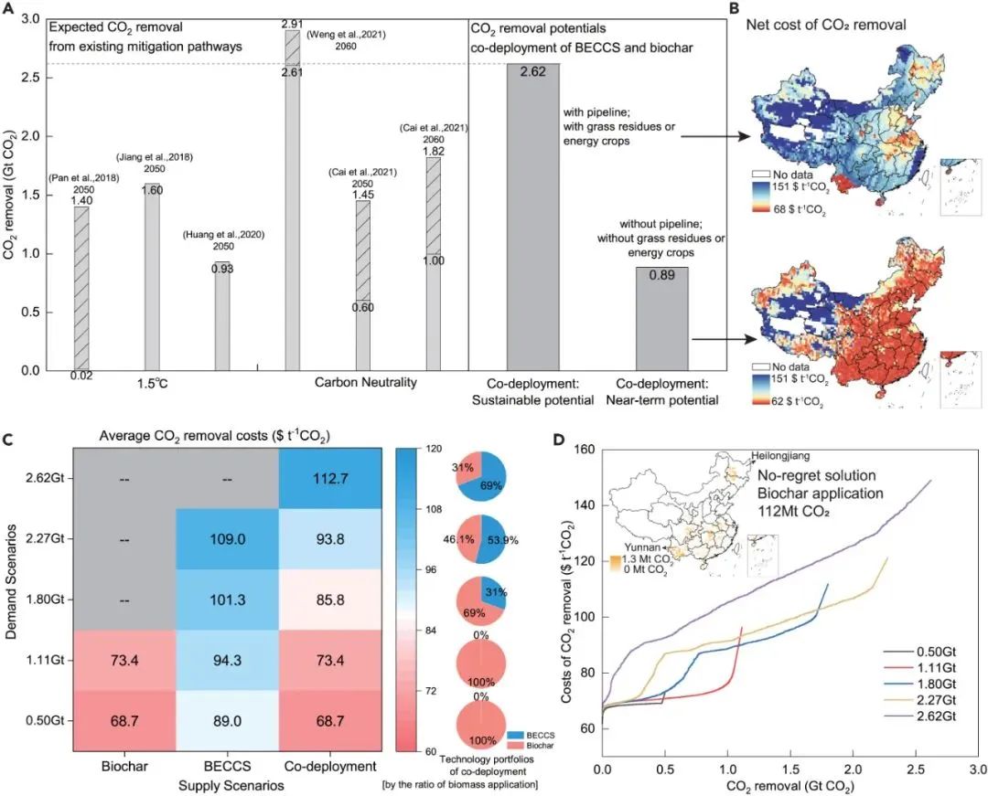 为实现碳中和目标,有必要在实施深度减排战略的同时部署二氧化碳移除(Carbon Dioxide Removal, CDR)技术,以抵消难减排行业的剩余排放。其中,两种生物质碳移除技术——生物能源结合碳捕集与封存技术(Bioenergy with Carbon Capture and Storage, BECCS)和生物炭(Biochar)——各有利弊,联合部署或能最大限度地发挥碳移除潜力,同时降低环境影响,但当前没有研究量化联合部署的潜力和经济可行性,阻碍了碳移除的早期和深度部署。