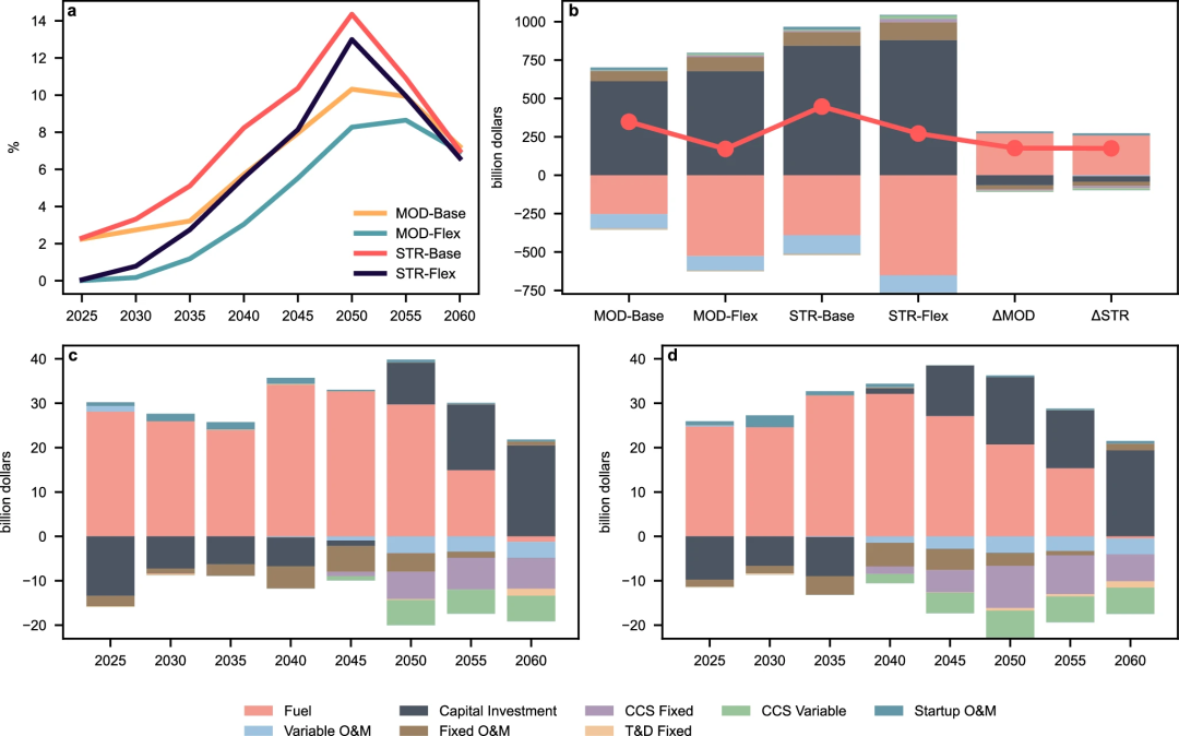 图3 电力系统转型成本动态及其构成(a为电力系统转型成本占REF-Flex情景系统总成本的比重;b为电力系统转型贴现的总成本构成;c和d分别为MOD和STR排放情景下煤电灵活调度带来的各期成本节约构成)