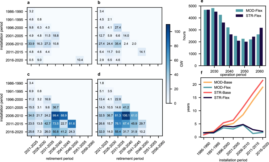 图1 煤电提前退役、利用小时数和预期寿命损失(a-d分别为MOD-Flex、STR-Flex、MOD-Base和STR-Base情景的提前退役容量热力图,e为不同运行期的平均利用小时数,f为不同时期建设的煤电平均寿命损失)