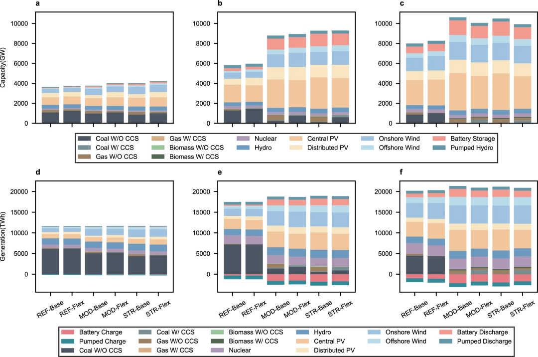 图2 不同情景和时期的中国电力系统装机容量和发电结构(a-c分别为2030年、2045年和2060年的分情景装机结构;d-e分别为2030年、2045年和2060年的分情景发电结构)