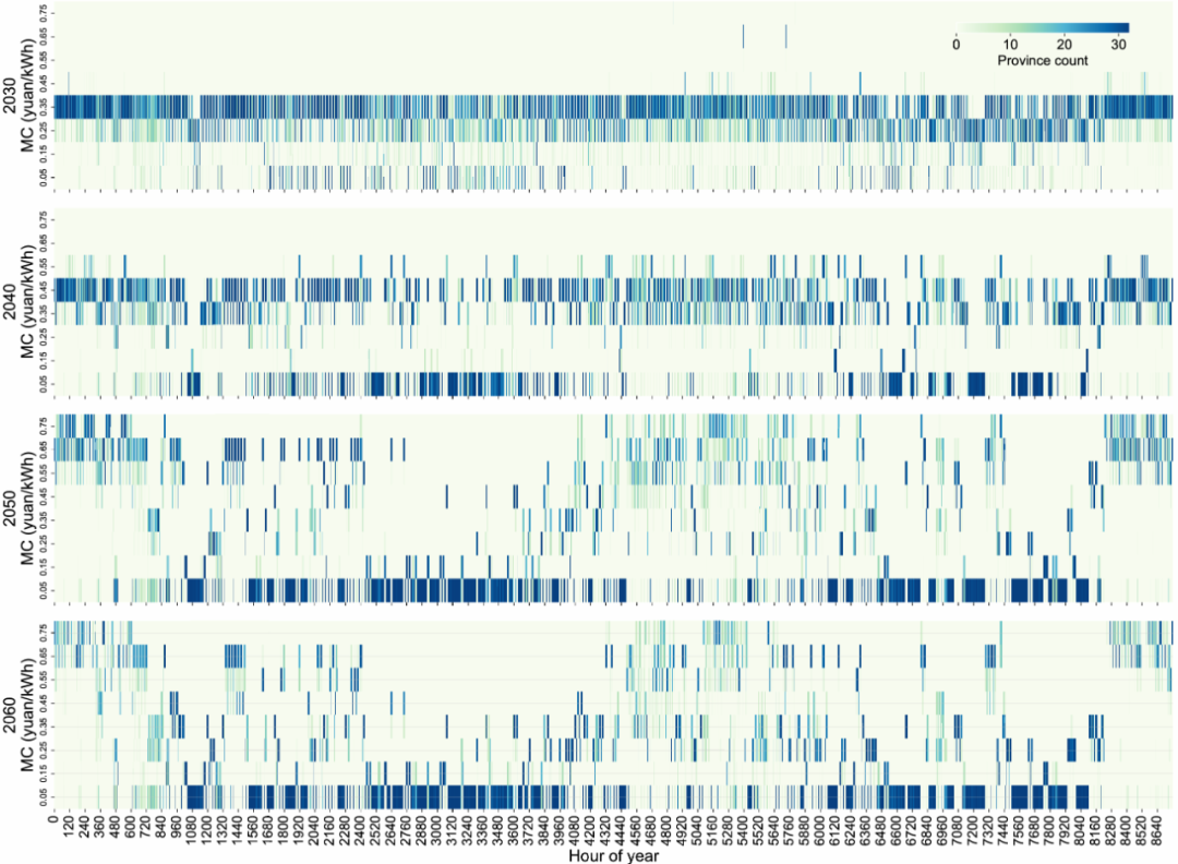 图5展示了全年逐小时各省份的电能量供给边际成本(Marginal Cost of Generation,MC,元/kWh)分布:随着大规模可再生能源的接入,电能量供给边际成本呈现更大的波动性,即极低(接近0)和极高(超过1.0元/kWh)情况出现的频率更高,这也表明电能量市场的波动性更大。