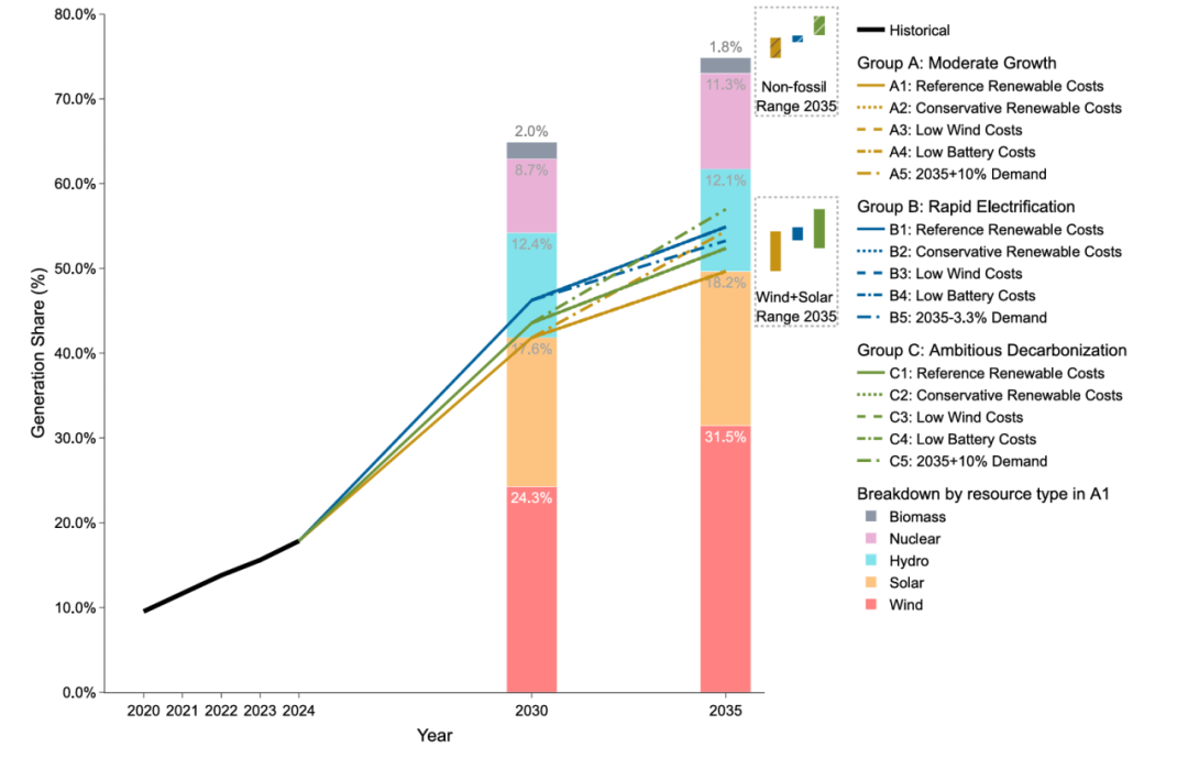图2. 2030年与2035年清洁能源发电占比。实线表示三种基准情景下风能和太阳能资源的总发电占比,虚线为文本所述未来情景。图中的柱状图显示情景A1下风能、太阳能、核能、水力发电及生物质能的发电占比,色带则表示未来情景下2035结果的范围。