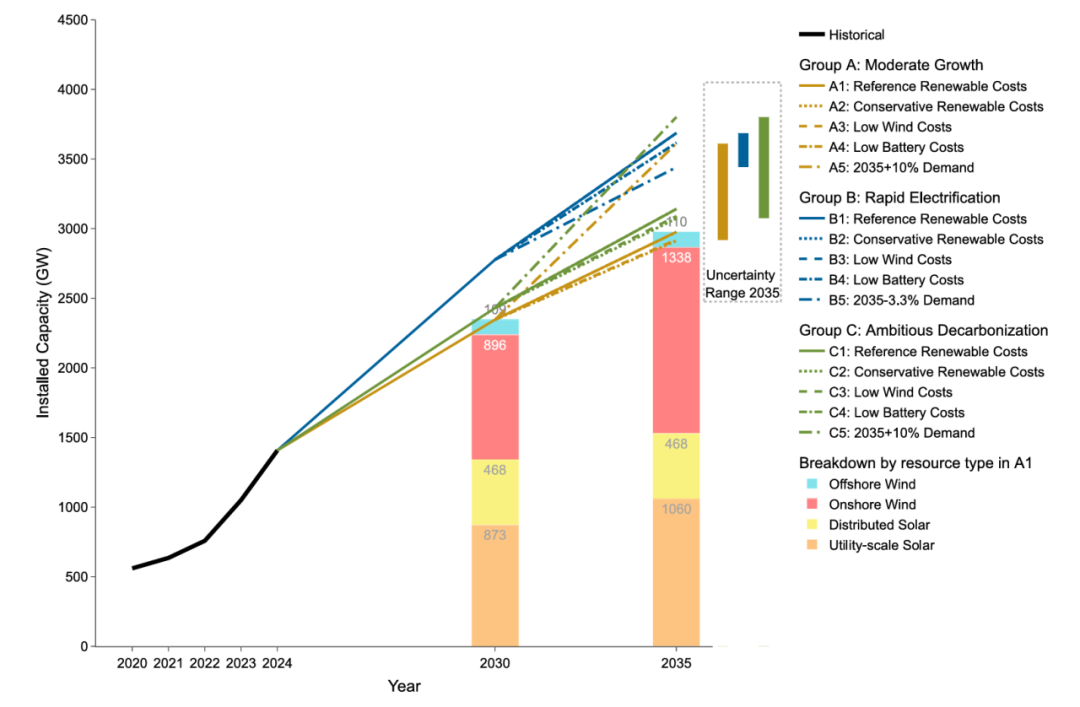 图1. 2030年与2035年风电及太阳能装机容量对比。实线表示三种基准情景下的风电与太阳能总装机容量,虚线对应文中所述的未来情景。图中的柱状图展示情景A1下不同技术类型的装机容量,色带则标示未来情景下2035年结果的范围。