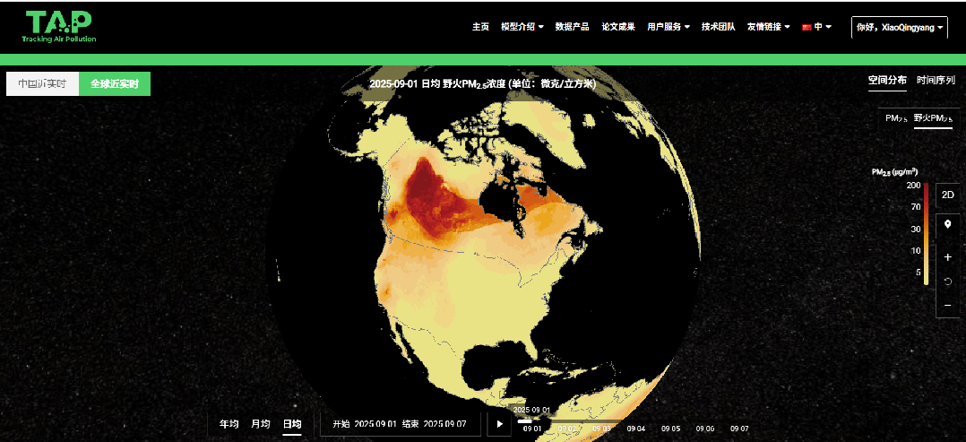 图1. TAP平台(//tapdata.org.cn)提供的全球野火PM2.5浓度近实时反演数据