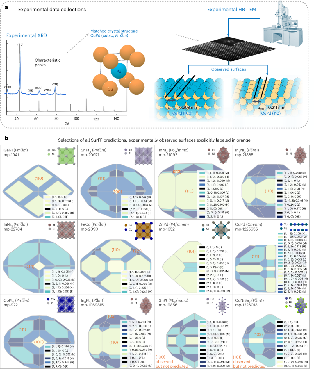 首先,团队针对催化材料表面是否稳定、能否合成这一基础性问题,创制了“SurFF”表面性质基础模型,通过主动学习策略构建了一个涵盖万余种合金表面的大规模数据库,以精准预测晶体材料的表面能和平衡形貌(Wulff构型)。在保持同等精度的前提下,SurFF比传统的密度泛函理论(DFT)计算效率提升了5个数量级以上,且首次实现了对数千种晶体材料可合成性与表面暴露情况的高通量筛选。同时,团队利用大语言模型挖掘了大规模文献数据(1万余篇催化文献XRD/TEM面指数信息),结合原创实验数据,在真实催化体系中验证了模型的准确性。该工作为催化剂理性设计及下一代自驱动材料研发闭环提供了坚实支撑。相关成果以“SurFF:一种跨金属间化合物晶体表面暴露与形貌的基础模型”(SurFF: A Foundation Model for Surface Exposure and Morphology Across Intermetallic Crystals)为题,于9月9日发表于《自然·计算科学》(Nature Computational Science)。