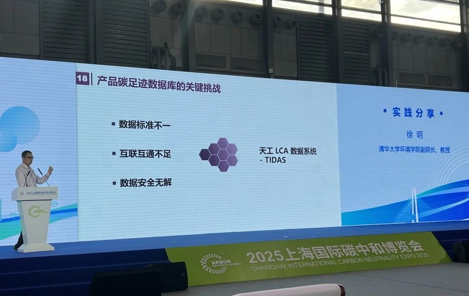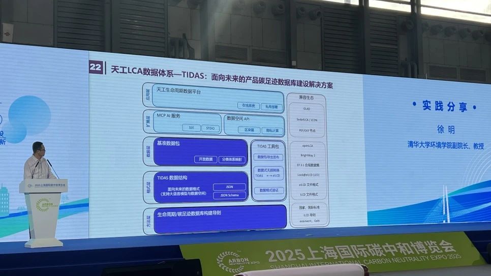 碳中和讲席教授、环境学院副院长徐明在2025上海国际碳博会上,代表联盟发布了“天工LCA数据系统”(TIDAS),提供LCA和碳足迹基础数据库建设解决方案。TIDAS包含LCA/碳足迹数据库构建导则、标准化数据结构和基础数据、成套开源工具,全面赋能数据库开发者高效开展数据库建设。