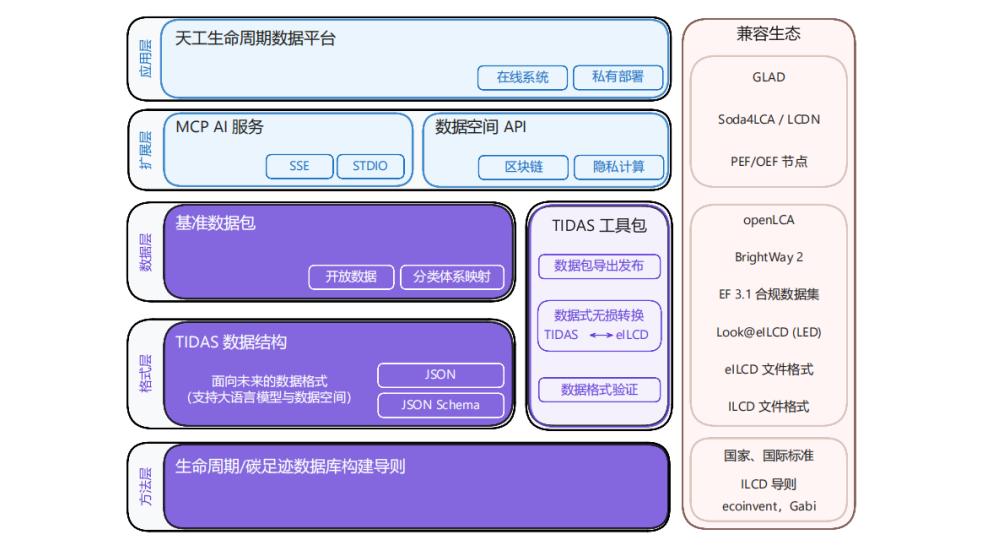 除此之外,TIDAS包含成套开源工具,提供合规性校验、数据库导出、以及同ILCD/eILCD等国际数据体系之间双向无损转换功能,均可快速部署使用。面向LCA和碳足迹数据管理和应用的实际需求和未来发展方向,TIDAS原生支持人工智能、区块链和可信数据空间等前沿技术的应用,提升数据库构建能力水平,并确保数据协作更加安全和高效。