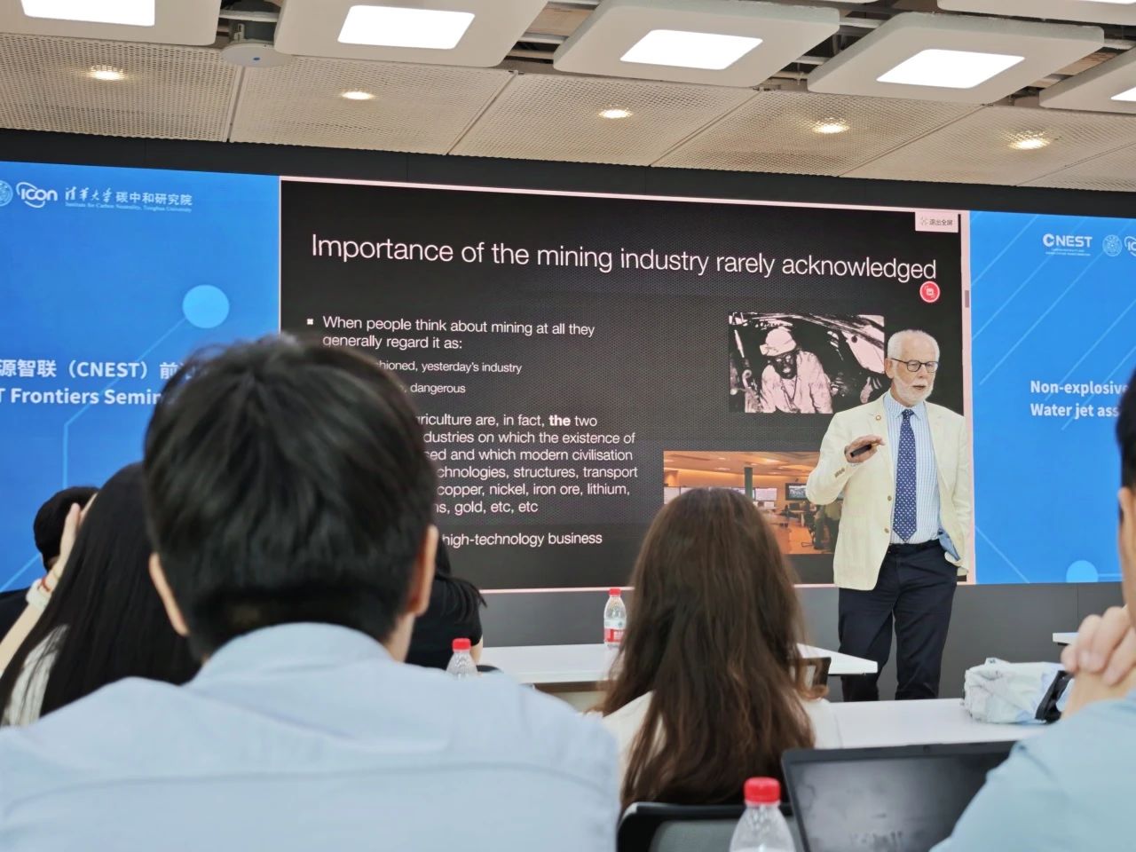 胡德院士作为全球矿业知名专家,还进一步就采矿业的技术发展及其对全球碳中和的意义作了分享。他作了题为《非爆炸性岩石破碎:水射流辅助切割》的报告,指出岩石破碎是采矿业中最重要的步骤,正消耗全球7%的电力,并分享了自1970年代以来他带领团队开发的多种矿业岩石破碎技术,以降低采矿机械的磨损、能源消耗和环境影响。