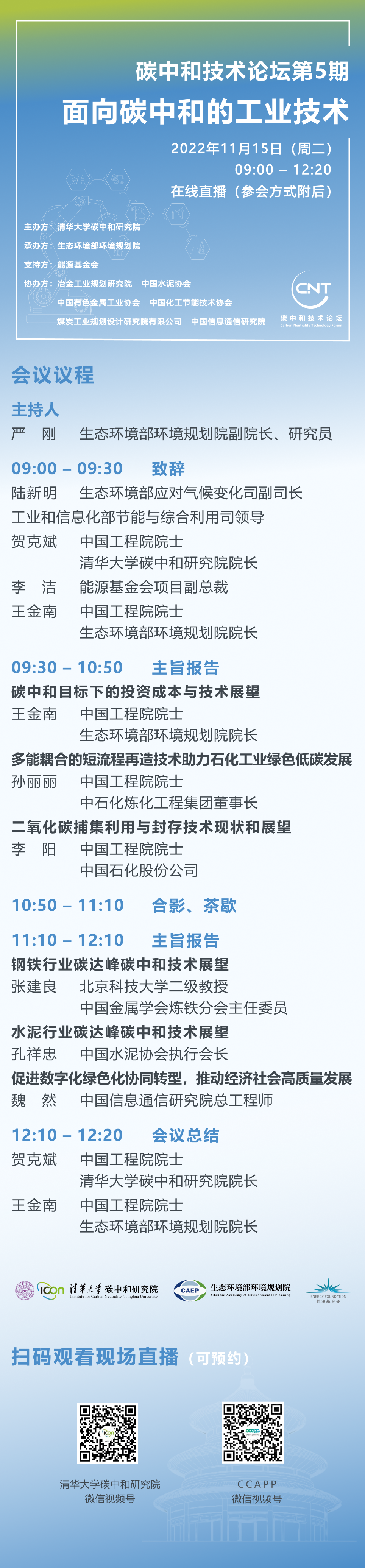 工业部门是我国国民经济中最重要的物质生产部门,同时也是能源消耗和二氧化碳排放的最主要领域。在“双碳”工作稳步推进的大背景下,工业部门肩负着重要的发展和减排责任,是我国如期实现2030年前碳达峰、2060年前碳中和目标的重要支撑。兹定于2022年11月15日上午9点,召开第五期碳中和技术论坛——“面向碳中和的工业技术”, 共同探讨面向“双碳”目标的工业行业碳减排技术,推动“双碳”目标下的工业高质量发展。会议以腾讯会议形式同步网络直播。