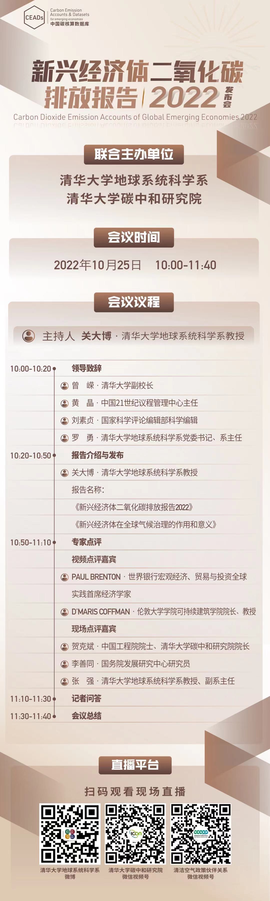 本次发布会活动将采用“线下会议+线上直播”方式同步进行,会议语言为中文。欢迎大家扫描下方二维码并收看现场直播,我们期待在《新兴经济体二氧化碳排放报告2022》发布会上与大家相聚。