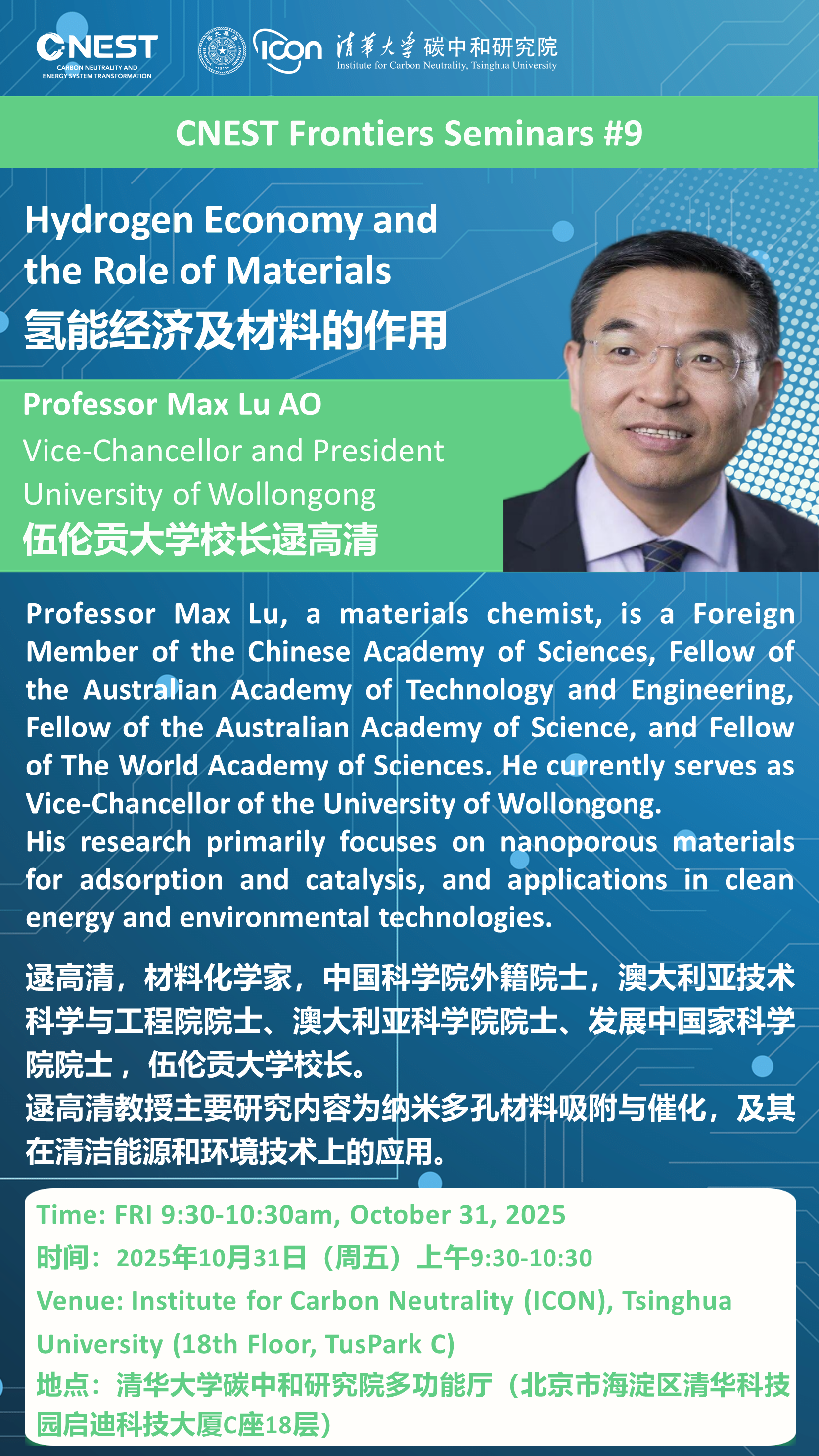 多功能厅举办。活动邀请中国科学院外籍院士、澳大利亚技术科学与工程院院士、澳大利亚科学院院士、发展中国家科学院院士 、伍伦贡大学校长逯高清教授就氢能经济及材料的作用进行主题演讲,并就相关话题进行交流讨论。CNEST前沿讲座是“碳中和系统科学与技术”一级学科博士研究生必修的碳中和技术前沿课程。欢迎报名参加!