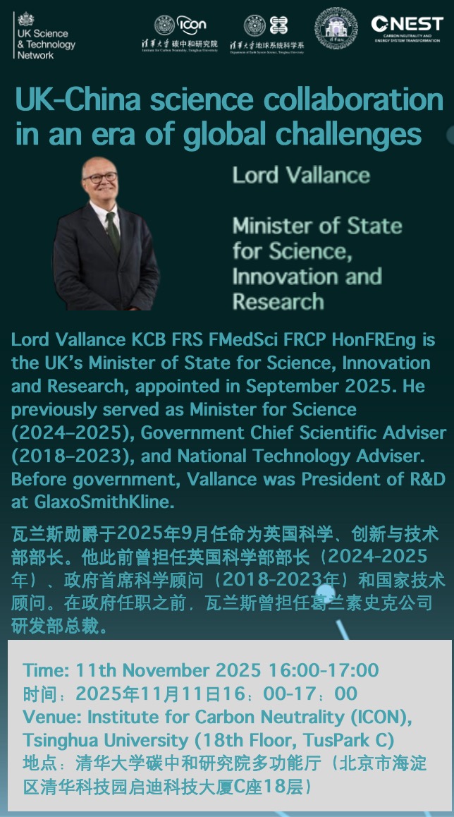 多功能厅举办。活动邀请英国科学、创新与技术部部长瓦兰斯勋爵就全球挑战下的中英科学合作进行主题演讲,并就相关话题进行交流讨论。CNEST前沿讲座是“碳中和系统科学与技术”一级学科博士研究生必修的碳中和技术前沿课程。欢迎报名参加!