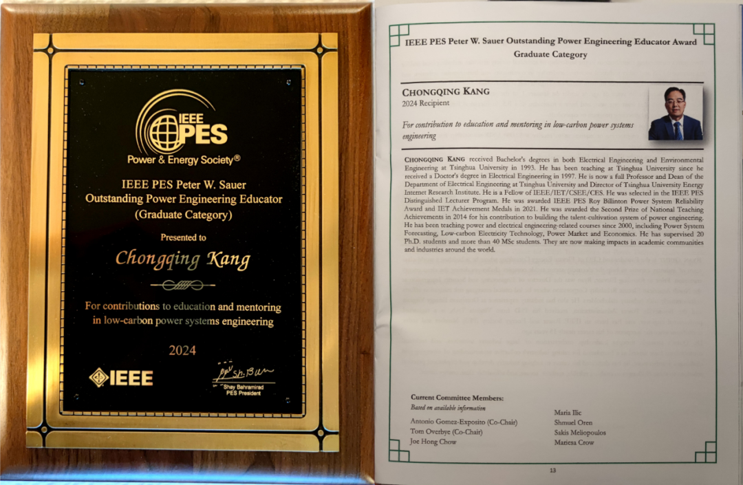 新型电力系统研究中心首席科学家、电机系教授康重庆受邀参加颁奖典礼并领取IEEE PES Peter W. Sauer杰出电力工程教育奖(IEEE PES Peter W. Sauer Outstanding Power Engineering Educator Award Graduate Category)。