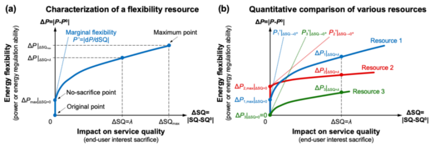 图3:基于服务质量的需求侧柔性定义新方法(a) 刻画某个柔性资源;(b) 多个柔性资源对比