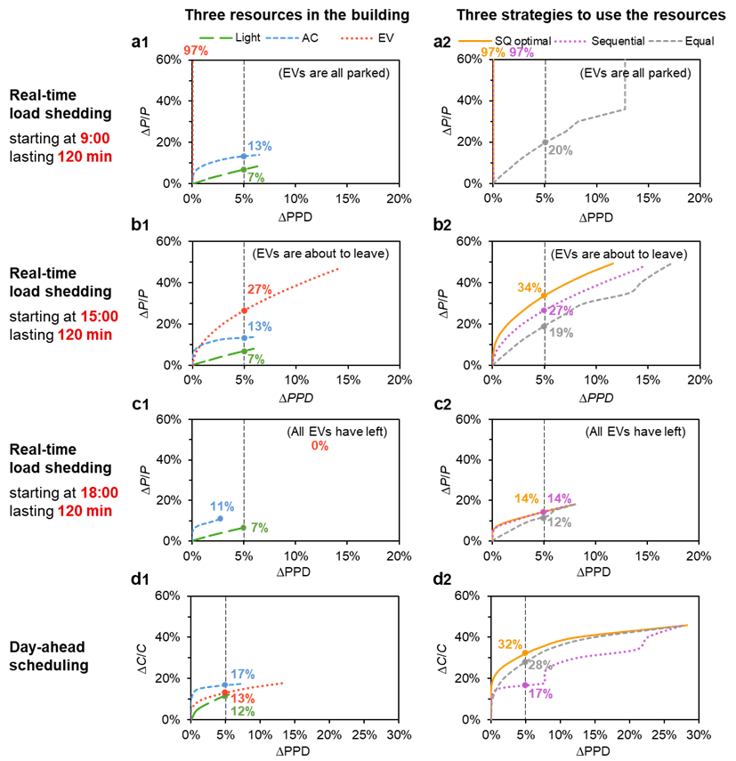 图4:用办公楼案例演示基于服务质量的需求侧柔性定义新方法(a) 从9:00开始持续120min的实时负荷削减;(b) 从15:00开始持续120min的实时负荷削减;(c) 从18:00开始持续120min的实时负荷削减;(d) 日前负荷调度